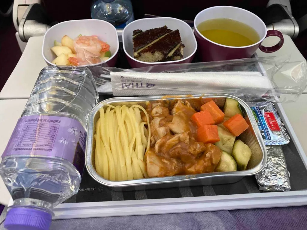タイ国際航空はLCCではないので、足元のスペースは当然LCCより広く、座席も比較的座りやすかった。また、搭乗後1時間ほどすると、機内食が提供された。機内食は、チキンのパスタか、スパイシーなポークから選べた。今回はチキンのパスタを選択した。ソースのかかったチキンと平麺のパスタ以外に、小さなエビがトッピングされているりんごの小皿と、蒸しパンの小皿、330mlのペットボトルの水、そしてコップが乗ったプレートが配られた。コップの中には、赤ワインや白ワイン、緑茶、コーラなどの飲み物から好きなものを注いでくれた。飲み物は頼めばいつでも持ってきてもらえた。離陸から3時間ほどで台湾の上空を通過した。台湾までで航路の半分ほどであるので、あと3時間ほどは飛行機の中で過ごす。飛行機の中で座っているのもそろそろ飽きてきた。座席は37Dで、真ん中の列の左通路側。トイレには行きやすいので、この席を選んで正解だったと思う。これまでの3時間は座席の前のモニターで映画を見るなどしていたが、機内にWi-Fiがあるし、USBの電源もあるので残りの時間はYouTubeでも見ようと思う。と思ったが、Wi-Fiで通信することができなかったので断念。ノイズキャンセリング機能付きのイヤホンを装着してみると、飛行機の音がかなり軽減された。音楽を聞きたい時以外にも、寝る時などに大きな効果があるかもしれない。残り2時間ほどになったところで乗り物酔いを感じたのでトラベルミンを一錠飲んだ。機内食で支給された水で飲んでみたが、至って普通の水だった。機内の冷房がかなり効いていて、毛布なしでは寒くなってきた。着陸の1時間ほど前に追加のペットボトルと、クッキーが提供された。それから20分ほど経つと、ゴミを回収してくれた。