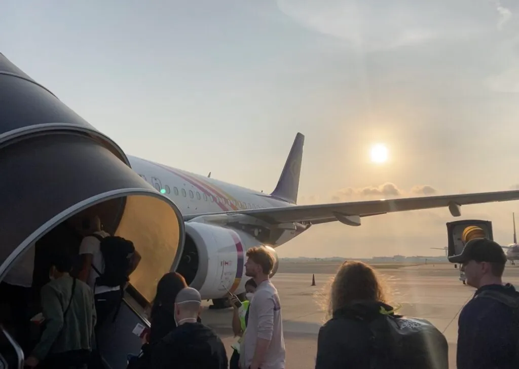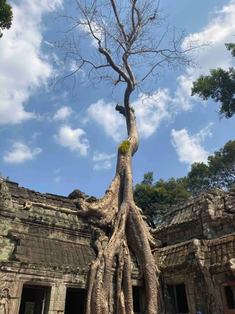 午前4時50分にアラームで目が覚めた。そろそろ飛行機のチェックインが始まっている時間なので、カウンターへ向かう。チケットをもらい、荷物検査を受け、パスポートチェックを受けて、制限エリア内へ。乗り込み時間を少し過ぎた頃、乗り込みのアナウンスが始まった。が、何を言っているのか全然聞き取れなかった。おそらく最初の方はプライオリティの人たちだと思い、少し待ってからゲートへ行った。スロープを下って行くと、外へ出た。そこからバスに乗って飛行機まで移動した。飛行機に乗ってからイミグレーションカードと税関申請書を書き、少し寝た。軽食が配られたタイミングで起き、それを食べた。チーズ入りはんぺんの春巻きのめちゃくちゃ太いバージョンみたいな食べ物だった。カンボジア(シェムリアップ)に到着後、入国審査を済ませて、ホテルまでトゥクトゥクに乗る。eビザを事前に取得しておいたおかげでアライバルビザを取る手間なく入国できた。カンボジアのトゥクトゥクは、運転手と荷台が完全に分かれているスタイルらしい。