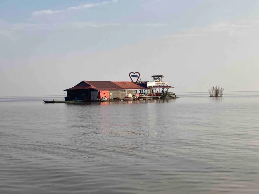 フローティングビレッジ。水上に建物がポツンとある。海かと思うくらい広い湖だった。