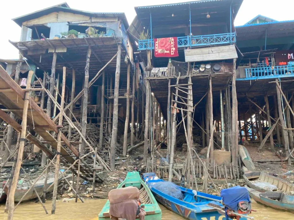午後2時10分くらいに迎えのバンがきて、乗り込んだ。運転手ともう1人、ガイドの人が乗っていた。ガイドの人は日本で少し勉強してたことがあって、日本がすごく好きらしい。ガイドの人いわく、トンレサップ湖までは40分くらいかかるみたい。道中、ガッタガタの道を進んでるなあと思ったら、運転手が段差を見逃していたようで、めちゃくちゃ跳ねた、というか、ほぼ飛んでた。着地したときの衝撃で車が壊れたらしく、動かなくなってしまったので、代わりの車を待つことになった。同乗者は韓国人男性2人とフランス人女性2人で、フランス人女性たちとは少し話をした。フランスではパンとかワインとかチーズをよく食べるらしい。フランス人女性の1人が、近くの屋台で芋とか何かをいろいろ混ぜたものを買ってきて、1つ分けてくれた。少し甘くて、スイートポテトの中身だけみたいな感じ。本当だったら3時にはトンレサップ湖に着いていたはずだけど、いつまで車を待つんだろう…。結局1時間ほど待ち、別の車に乗り込む。そこから10〜20分ほど移動し、船に乗った。